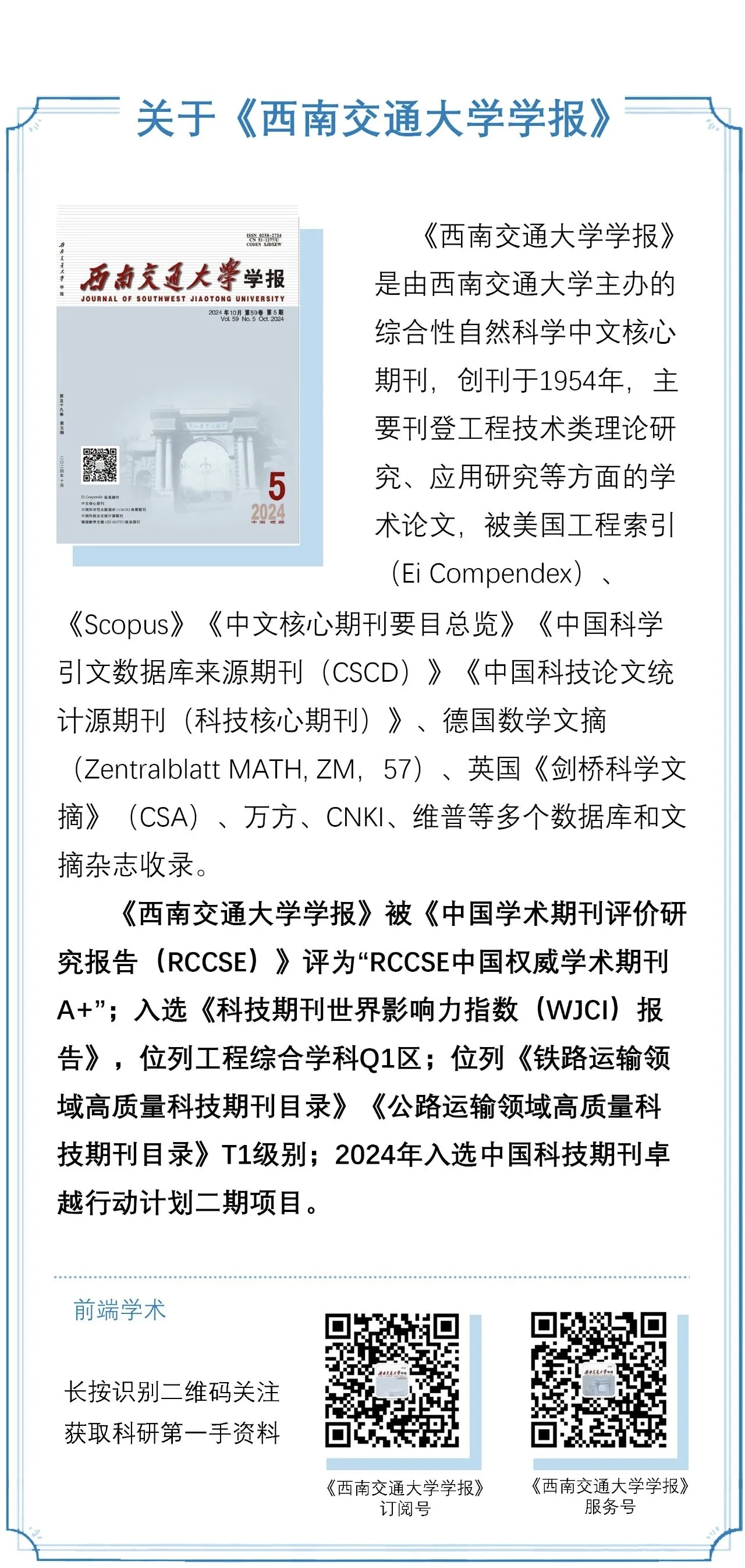 《西南交通大学学报》作为展示学术成果的重要平台,始终坚持“严谨、创新、求真”的办刊宗旨。为献礼校庆,《学报》拟于校庆期间出版“130周年校庆专刊”(正刊)。