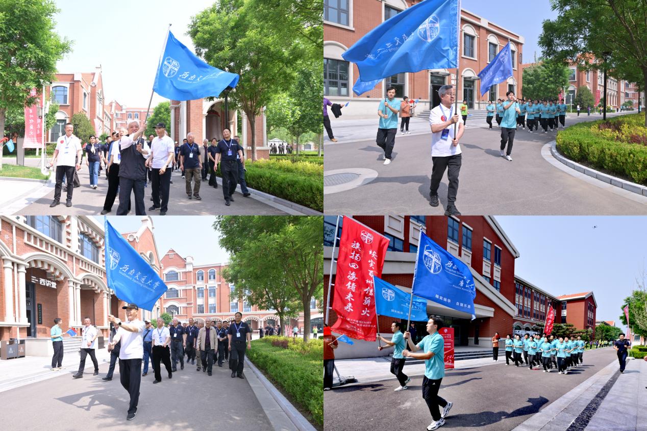 高平平为第一棒领跑者唐山校友会副会长刘冬彬授旗。高平平、蔡庆华鸣笛启动校旗传递活动。