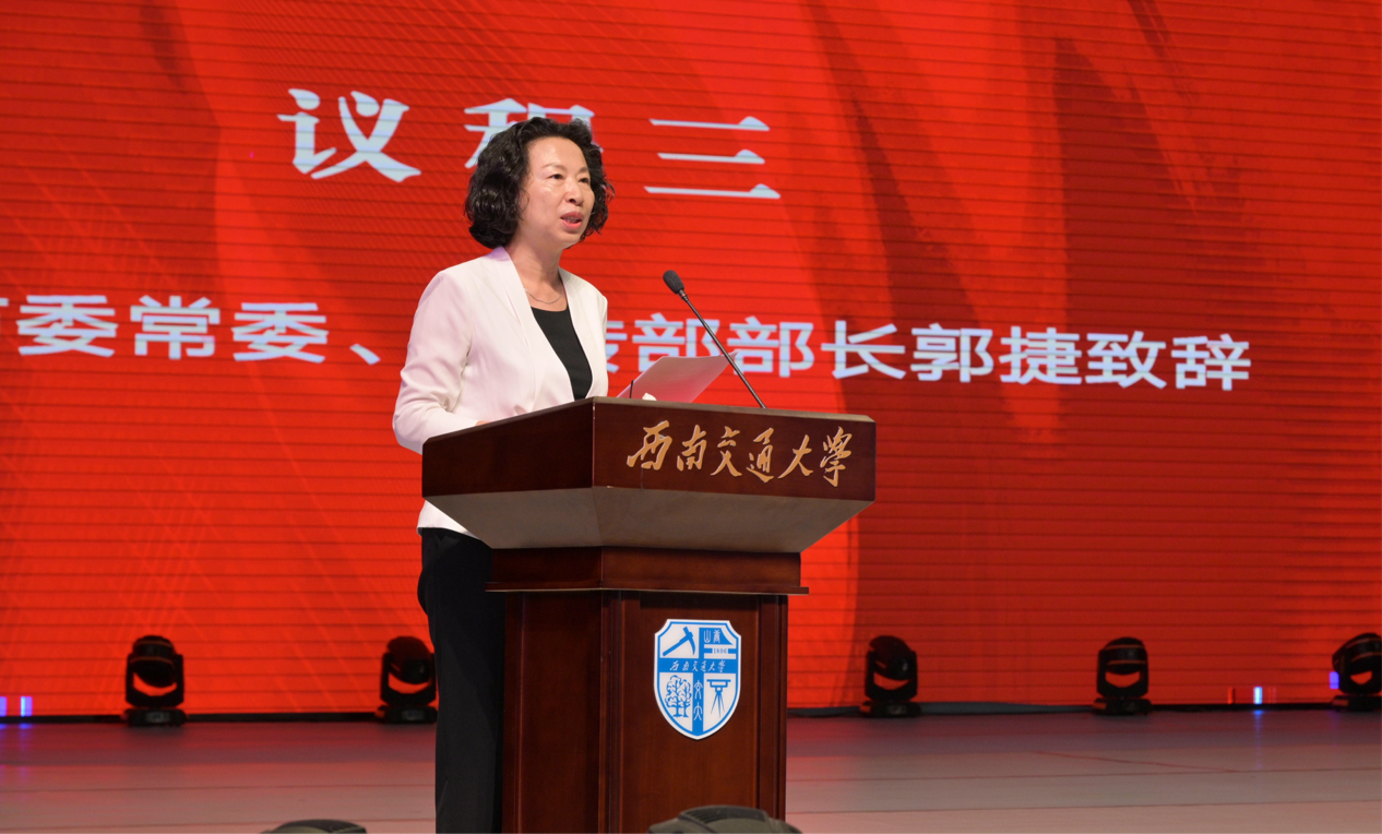 郭捷代表乐山市委市政府致辞。她表示,西南交通大学129年来始终与民族共命运,铸就了“竢实扬华,自强不息”的交大精神,培养了茅以升等大批杰出人才。自1964年扎根乐山以来,学校与这座城市风雨同舟六十余载,取得了一系列重要成果。郭捷谈到,乐山作为成渝双城经济圈的重要节点,发展前景广阔,呼吁学校广大校友当好发展参谋,为乐山高质量发展建言献策;做好校企桥梁,引荐优质项目资源;担当城市代言,向世界传播乐山的自然与人文魅力,吸引更多人才汇聚于此,共同谱写校地合作新篇章。