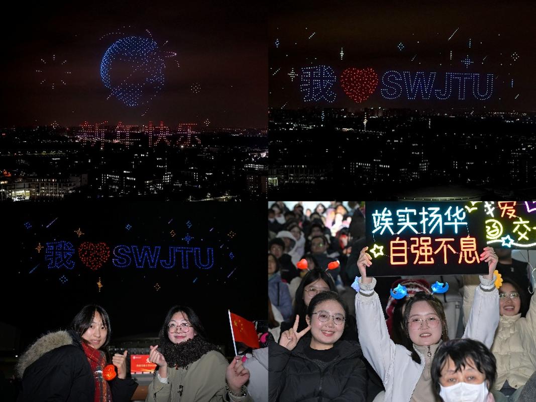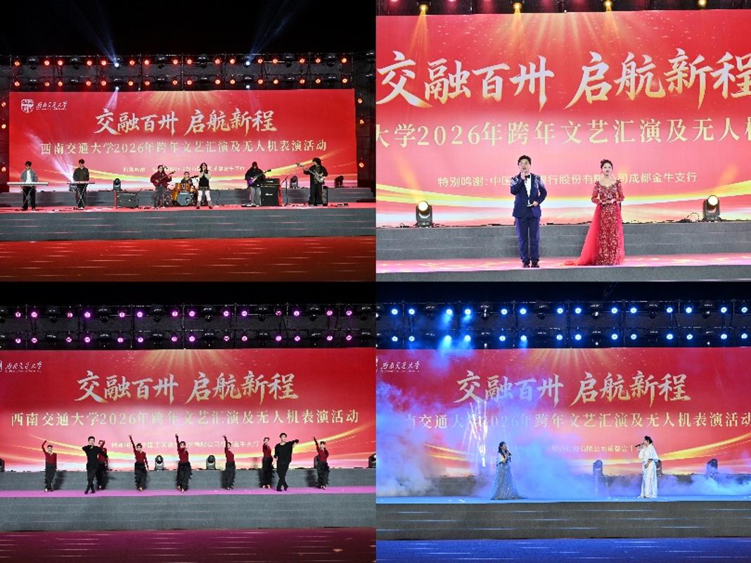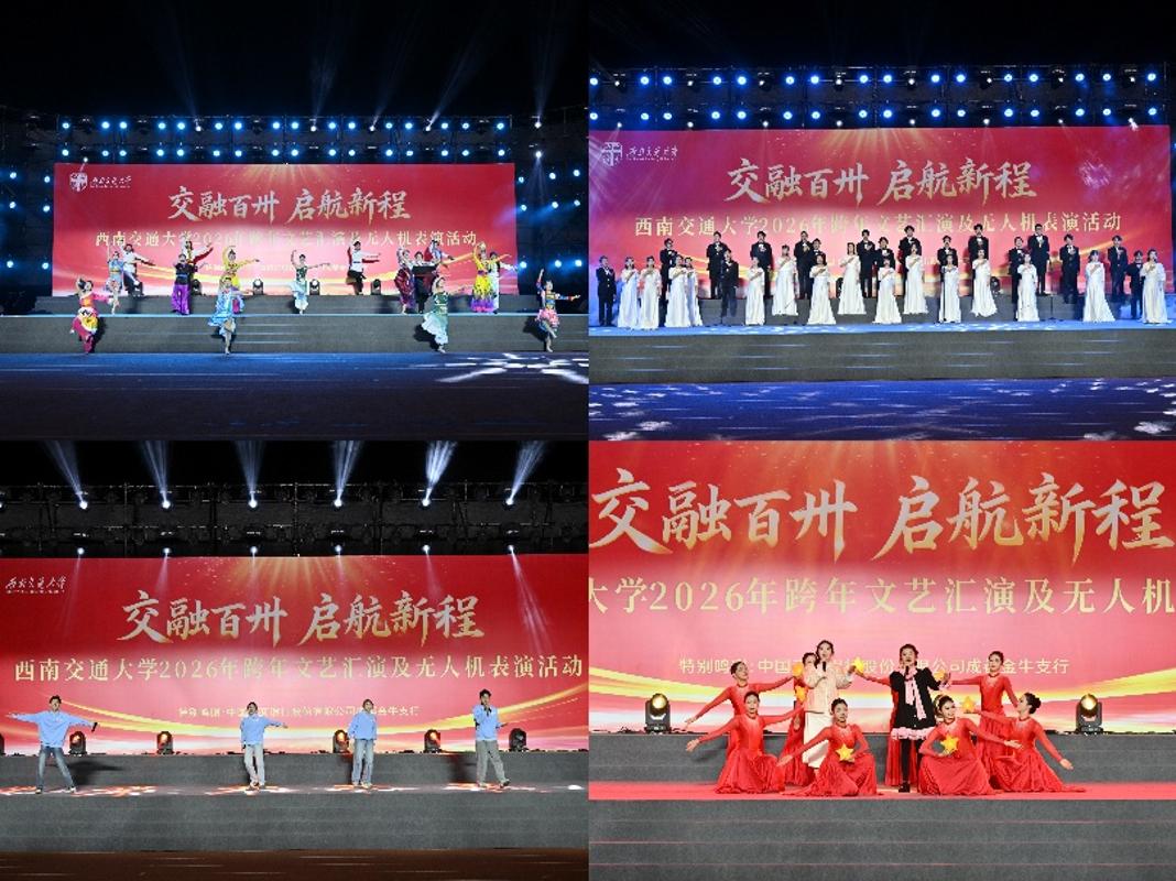 岁序更替,华章新启;载歌载舞,漫天华彩。12月31日晚,西南交通大学2026年跨年文艺汇演及无人机表演活动在犀浦校区北区体育场举行。学校党委书记余敏明,校长闫学东,党委副书记杨爱华,党委副书记、纪委书记夏玉峰,党委副书记高平平,党委常委、副校长康国政、刘长军、王平、何正友、晏启祥,党委常委汪铮、朱剑松,校长助理宋新,中国工商银行股份有限公司成都金牛支行党委书记、行长田庆与学校近万名师生员工、校友欢聚一堂,共迎新年。