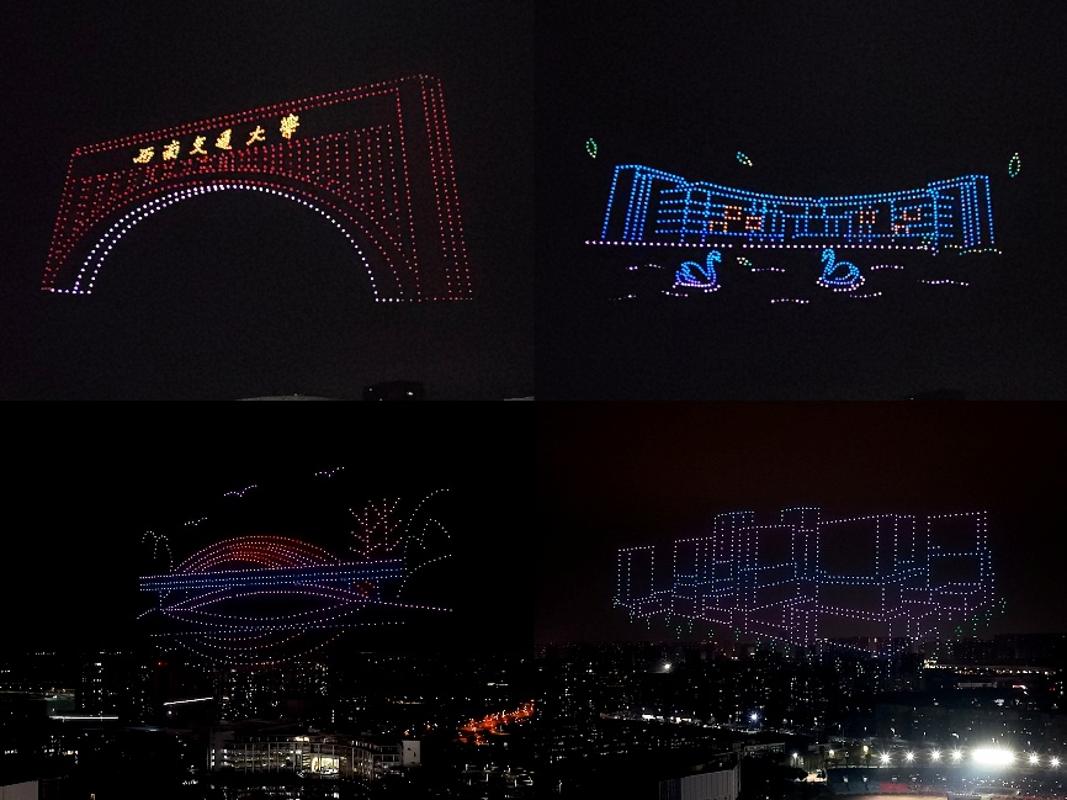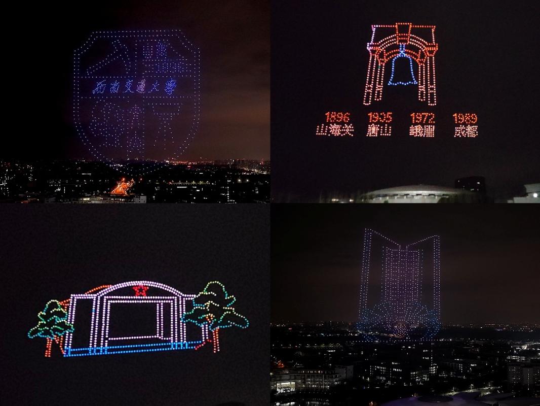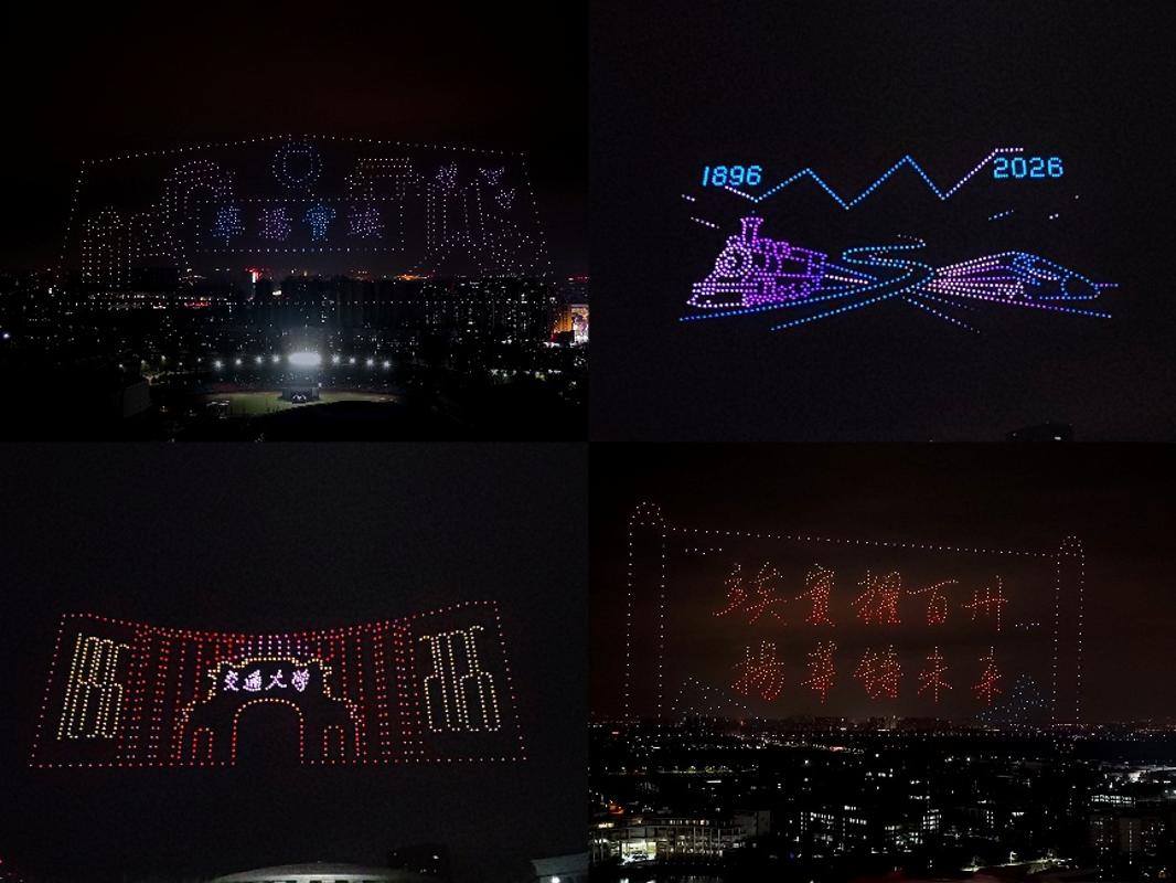 紧接着无人机编队以夜空为幕,呈现出一场科技与浪漫交汇的视觉盛宴。光影变幻间,交大校徽清晰浮现,彰显学校学科特色,蕴含学校树人初心。钟亭再现了“山海关”“唐山”“峨眉”和“成都”四个重要办学时期和搬迁历程。峨眉校区的名山电影场、九里校区的“聚与散”雕塑、犀浦校区的图书馆与虹桥、东部(国际)校区的建筑群,四校区标志性建筑的画面次第展现,串联起学校跨越时空的发展脉络。竢实扬华墙勾勒出学校的百年沧桑和风雨历程,从1896到2026,百卅岁月薪火相传,130周年校庆标识和主题标语相继定格夜空,寓意着学校在发展中传承历史、继往开来、再启新篇。“祝全球交大人新年快乐”“我爱交大”,现场一声声炽热的呼喊久久回响。