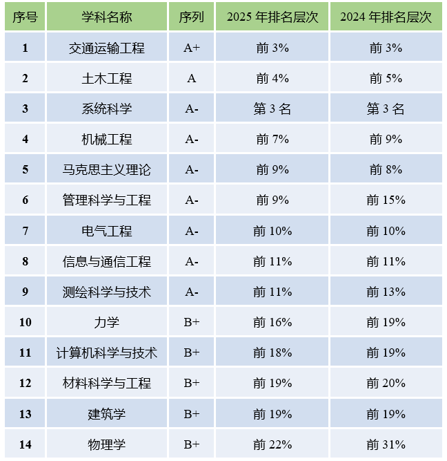 西南交通大学软科中国最好学科A类及B+类上榜学科