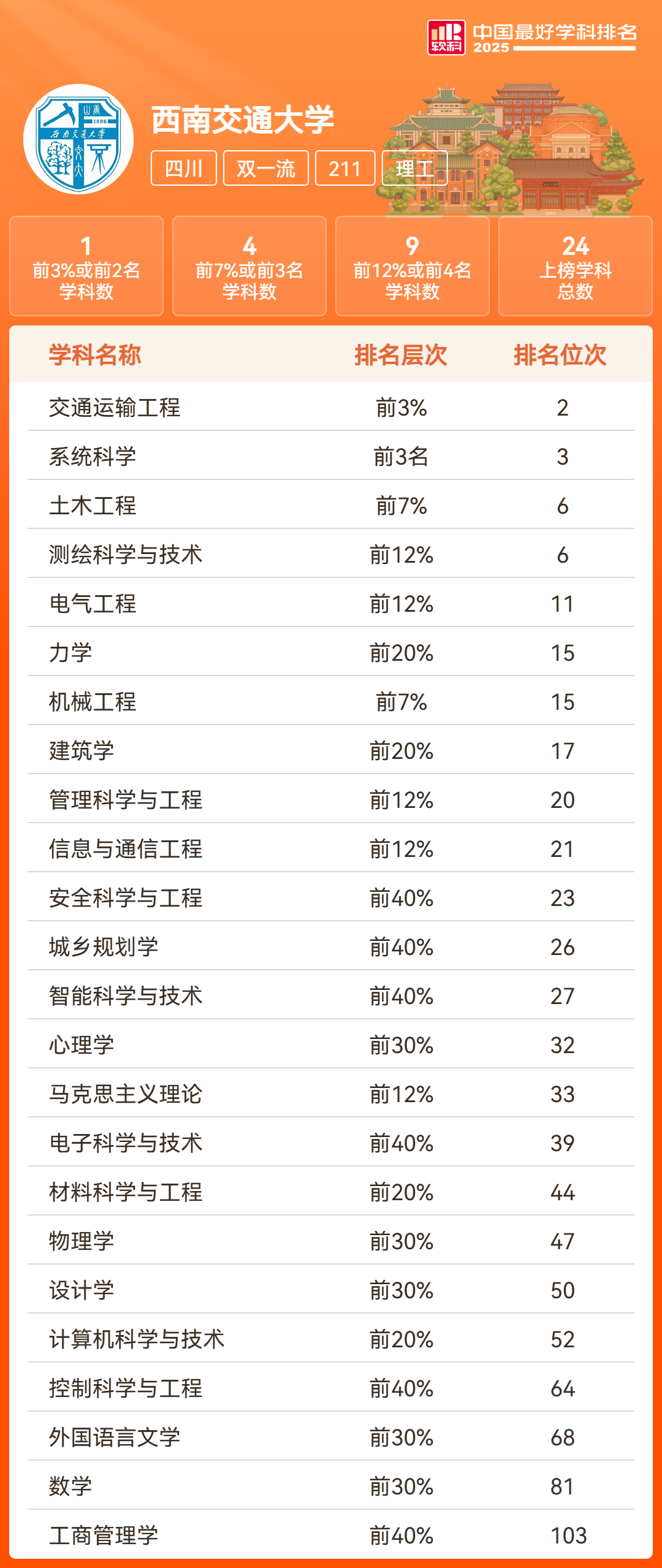西南交通大学软科中国最好学科上榜学科一览表